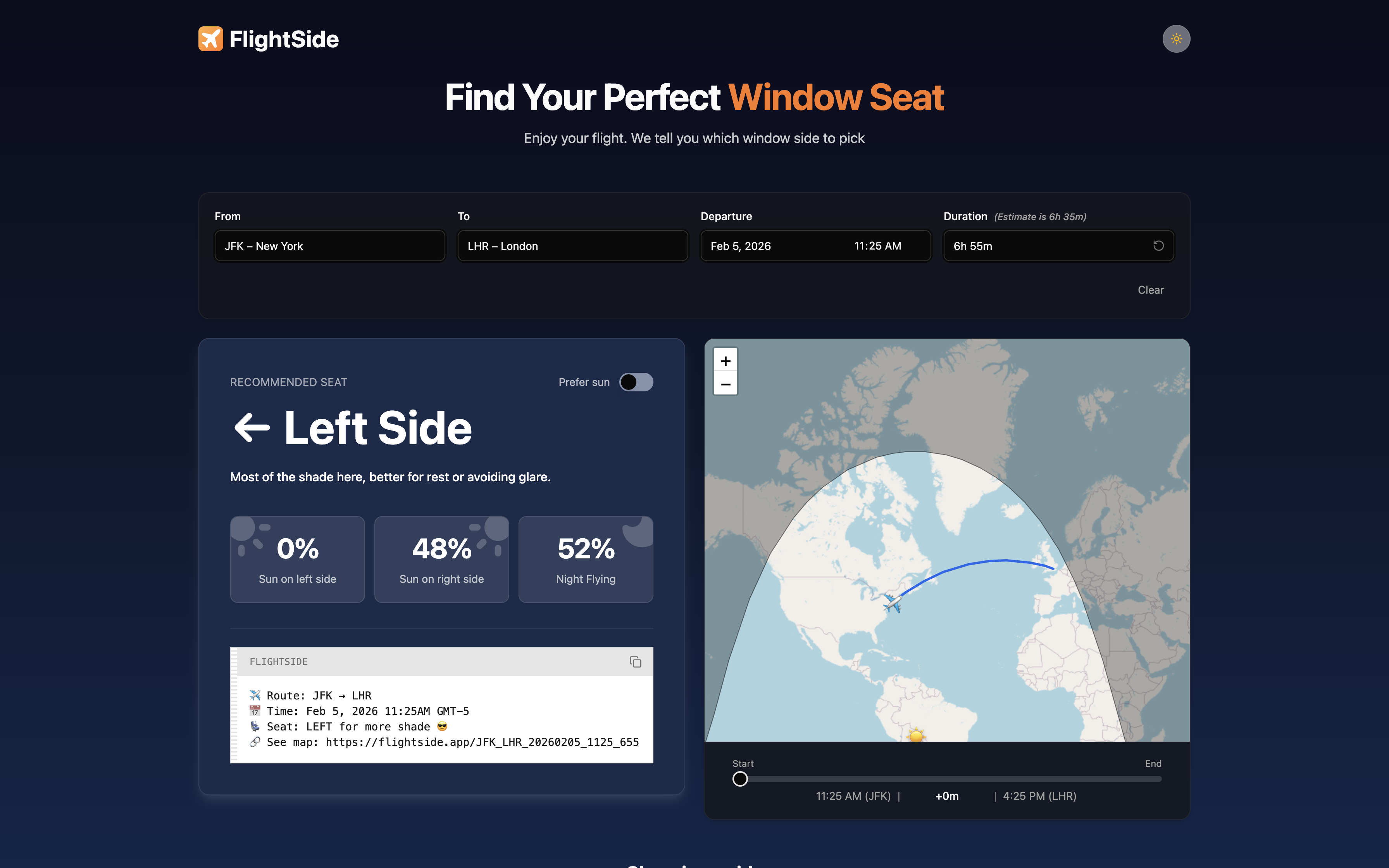 A small, free tool that shows which side of your flight gets sun or shade (and when it's dark). Built for frequent flyers who like knowing what they're getting before check-in